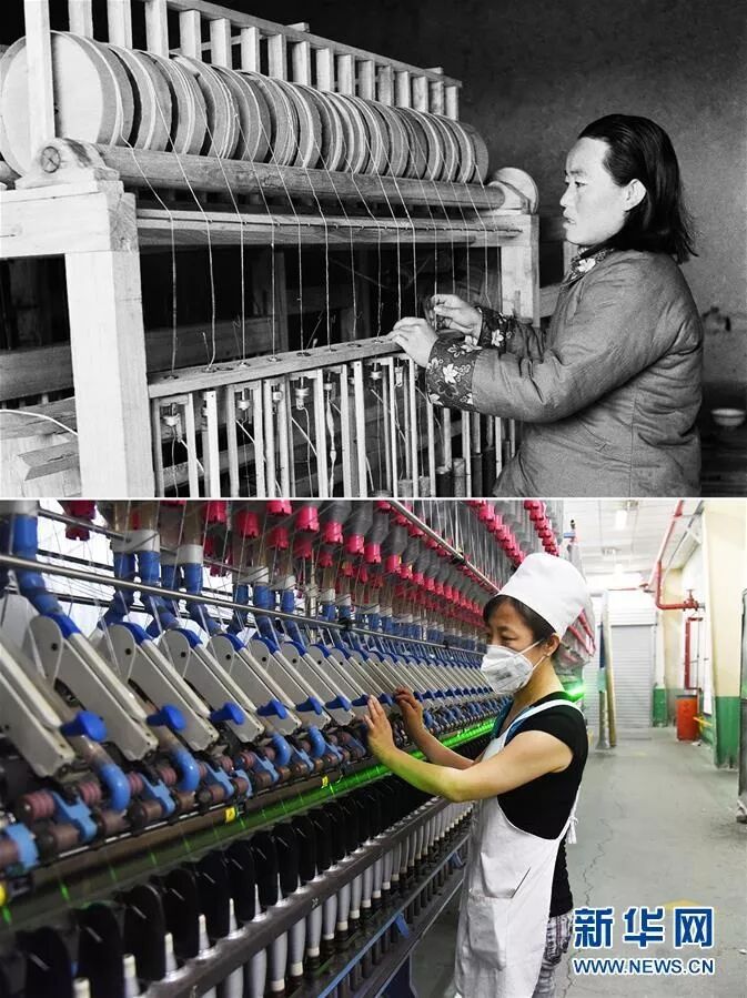 拼版照片:上图为1958年,在山东省高唐县,一名纺织工人用土制纺纱机纺布(资料照片);下图为2019年6月25日,在山东省高唐县超越纺织有限公司,工人田桂兰在操作新一代智能细纱机进行石墨烯纱线的纺纱作业(新华社记者王凯摄)。