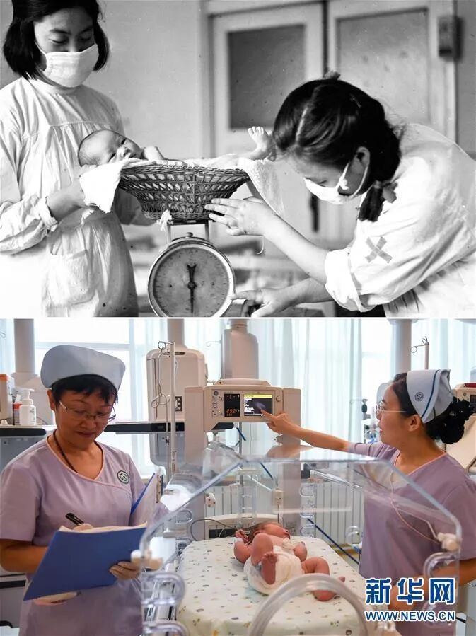 拼版照片:上图为1950年,辽宁鞍山职工医院医务人员在为婴儿称体重(新华社记者王纯德摄);下图为2019年7月19日,在内蒙古呼和浩特,内蒙古自治区人民医院新生儿科护士长杨晓玲(右)和同事用多功能保温箱为婴儿称体重(新华社记者彭源摄)。