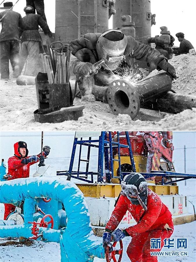 拼版照片:上图为1959年,新疆克拉玛依油田工人在建设九号集油区(新华社记者武纯展摄);下图为2019年1月15日,新疆油田公司风城油田作业区员工孙晟(前)和王晓东在重18井区对油井实施增产措施(吴小川摄)。