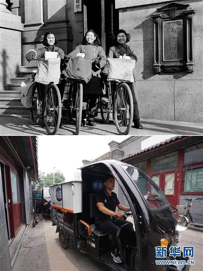 拼版照片:上图为1951年,北京市邮政管理局的三名女邮递员一早准备出发工作(新华社记者牛畏予摄);下图为2019年6月26日,北京市前门石头胡同顺丰快递点快递小哥刘阔驾驶电动车出发送快递(新华社记者鞠焕宗摄)。